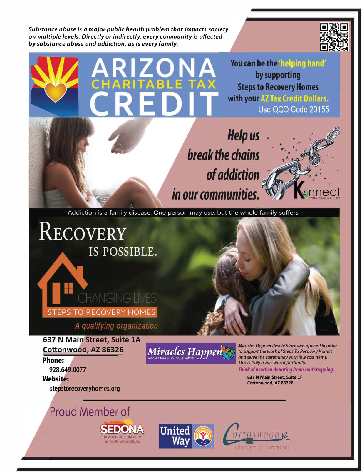 Our primary purpose is to create a healthy, safe, and structured environment for clients. We aim to assist our community by helping individuals become productive members of society, thereby reducing recidivism rates in the areas we serve. Steps To Recovery Homes is a state-licensed center for substance use disorder and mental health treatment. We provide services to all Yavapai County residents, regardless of their ability to pay. Steps To Recovery Homes operates two recovery homes, a resale thrift store called “Miracles Happen,” a warehouse, a career and workforce development program, an outpatient treatment center, and an event center called the Connection Room.