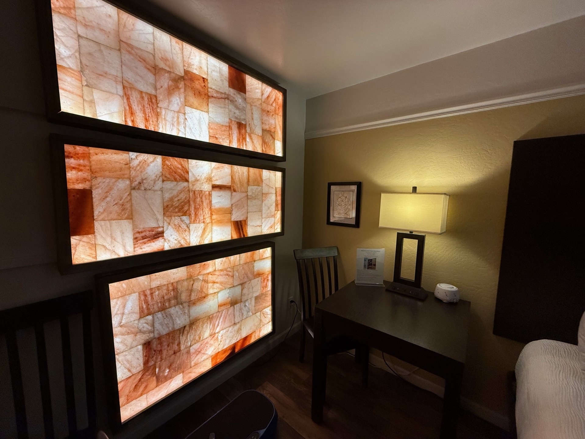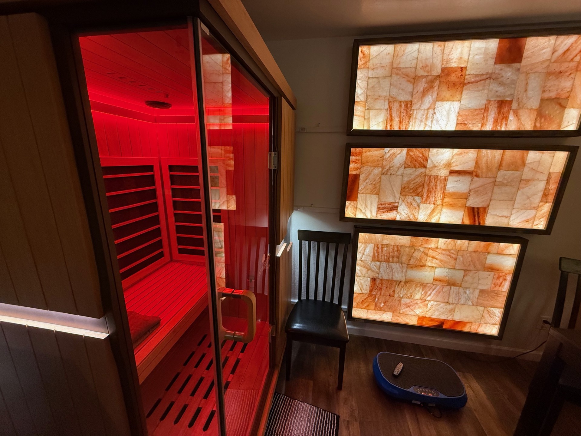 Infrared Sauna, Himalayan Salt Wall Panels, Anti-Gravity Chair, Purified Air and Vibration Plate.